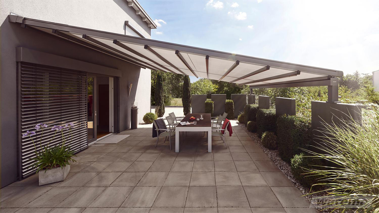 Filigrane Pergolamarkise für den Einsatz als Sonnen- und Regenschutz